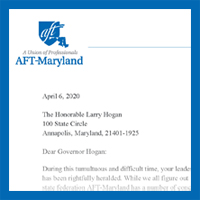 On Monday, April 6, 2020, AFT-Maryland sent this open letter to Gov. Larry Hogan regarding local and state public employees in the state of Maryland.